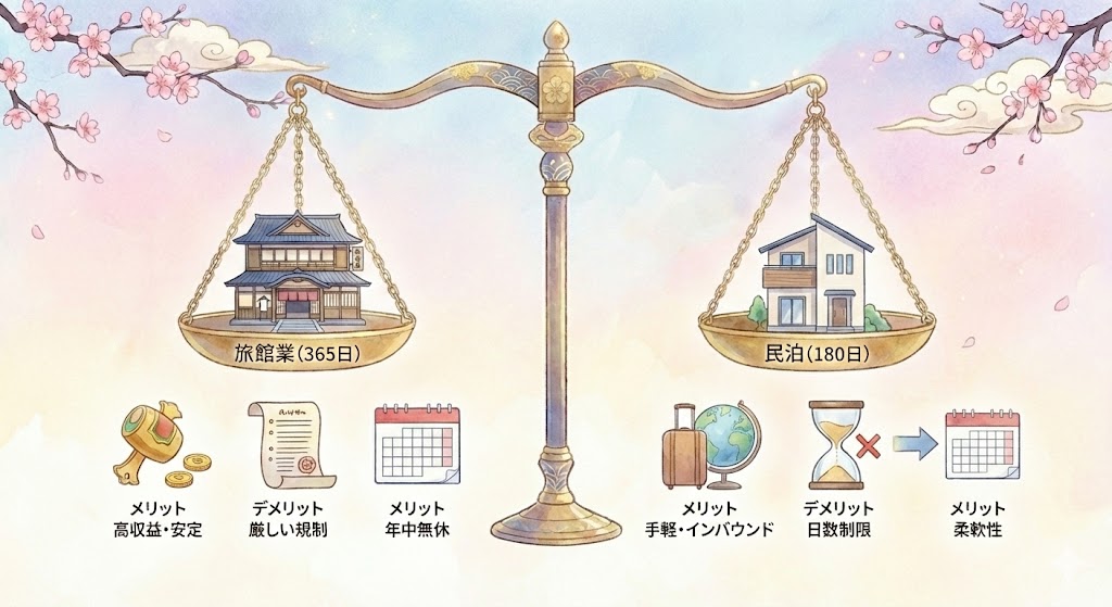 リゾート宿泊事業において、旅館業法(簡易宿所)と住宅宿泊事業法(民泊新法)のどちらを選ぶかは、単なる手続きの選択ではありません。
