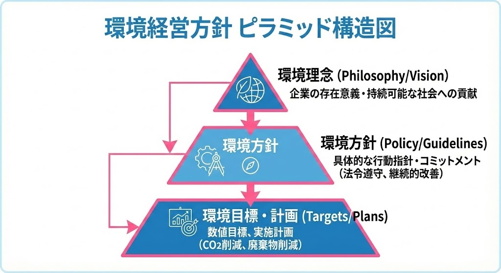 環境経営方針とは、会社が環境に対してどのように取り組むのか、その基本的な考え方(理念)と具体的な行動ルール(指針)を明文化した、いわば「環境に関する会社の憲法」です。